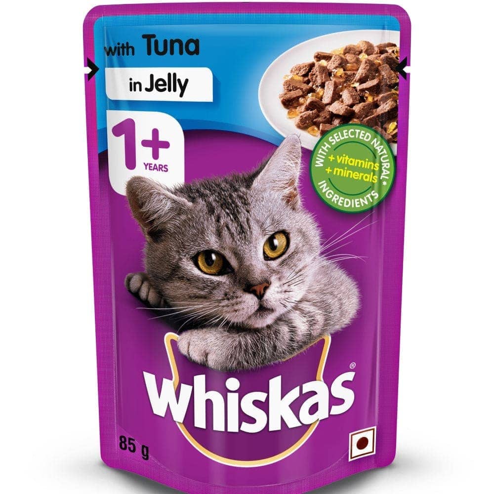 - Whiskas Tuna in Jelly adult cat food is designed to take care of your cat’s daily nutritional requirements and provide it with all the protein, vitamins and minerals it needs for a healthy and happy life.